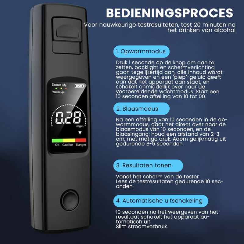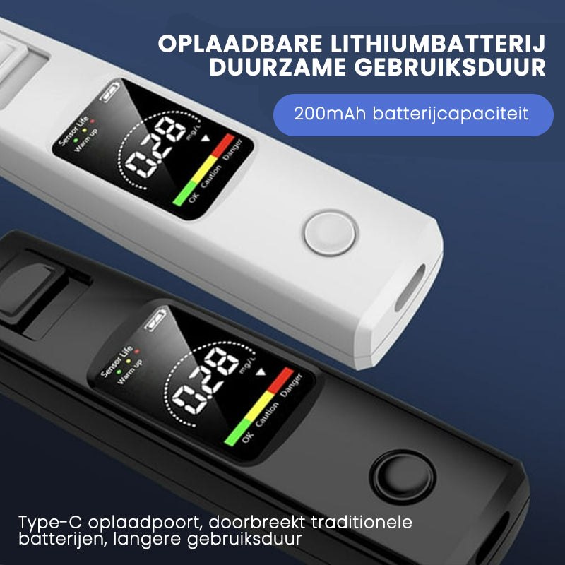 {"id":7464327970898,"title":"Draagbare Alcoholtester – Weet of je veilig kunt rijden","handle":"portable-alcohol-tester","description":"\u003cp style=\"text-align: center;\"\u003e\u003cstrong\u003eSnel, betrouwbaar en compact. Meet je alcoholpromillage binnen 10 seconden – ideaal voor onderweg, feestjes en voor het autorijden.\u003c\/strong\u003e\u003c\/p\u003e\n\u003cp\u003e\u003cstrong\u003e\u003cimg src=\"https:\/\/cdn.shopify.com\/s\/files\/1\/0554\/6406\/7257\/files\/portable-breathalyzer.jpg?v=1749709715\" alt=\"\"\u003e\u003cimg alt=\"\" src=\"https:\/\/cdn.shopify.com\/s\/files\/1\/0554\/6406\/7257\/files\/fm_4bb14fa0-eb8e-408f-b4b9-4c69126c4cd4.jpg?v=1749805858\"\u003e\u003c\/strong\u003e\u003c\/p\u003e\n\u003ch4\u003e\u003cspan style=\"color: rgb(255, 128, 0);\"\u003eKENMERKEN\u003c\/span\u003e\u003c\/h4\u003e\n\u003cul\u003e\n\u003cli\u003e\n\u003cp\u003e\u003cstrong\u003eZeer nauwkeurige meting\u003c\/strong\u003e\u003cbr\u003eMaakt gebruik van geavanceerde sensoren om alcoholniveaus te detecteren met een hoge gevoeligheid en minimale interferentie. Krijg binnen enkele seconden betrouwbare resultaten.\u003c\/p\u003e\n\u003c\/li\u003e\n\u003cli\u003e\n\u003cp\u003e\u003cstrong\u003eHD-kleurenscherm\u003c\/strong\u003e\u003cbr\u003eUitgerust met een helder en kleurrijk scherm worden gegevens intuïtief en leesbaar weergegeven, zelfs 's nachts.\u003c\/p\u003e\n\u003c\/li\u003e\n\u003c\/ul\u003e\n\u003cp\u003e\u003cimg src=\"https:\/\/cdn.shopify.com\/s\/files\/1\/0284\/4187\/0418\/files\/4_e6f86285-2ca3-4e6f-a637-d1613c46c1b4.jpg?v=1750153236\" alt=\"\"\u003e\u003c\/p\u003e\n\u003cul\u003e\n\u003cli\u003e\n\u003cp\u003e\u003cstrong\u003e3-kleurig indicatielampje\u003c\/strong\u003e\u003cbr\u003eRode, gele en groene indicatielampjes geven je alcoholpromillage in één oogopslag weer. Begrijp je status zonder getallen te interpreteren.\u003c\/p\u003e\n\u003c\/li\u003e\n\u003cli\u003e\n\u003cp\u003e\u003cstrong\u003eIngebouwde zuiveringskamer\u003c\/strong\u003e\u003cbr\u003eFiltert onzuiverheden weg voor nauwkeurige, hygiënische en contactloze tests. Vermindert het risico op verontreiniging en verhoogt de nauwkeurigheid.\u003c\/p\u003e\n\u003c\/li\u003e\n\u003c\/ul\u003e\n\u003cp\u003e\u003cimg src=\"https:\/\/cdn.shopify.com\/s\/files\/1\/0284\/4187\/0418\/files\/5_bc5102aa-525e-49b3-bc00-2ec841216d39.jpg?v=1750153236\" alt=\"\"\u003e\u003c\/p\u003e\n\u003cul\u003e\n\u003cli\u003e\n\u003cp\u003e\u003cstrong\u003eHoorbaar alcoholalarm\u003c\/strong\u003e\u003cbr\u003eJe hoeft er niet naar te raden - geluidssignalen waarschuwen je als je boven de wettelijke limiet zit en niet mag rijden.\u003c\/p\u003e\n\u003c\/li\u003e\n\u003cli\u003e\n\u003cp\u003e\u003cstrong\u003eOplaadbare batterij\u003c\/strong\u003e\u003cbr\u003eInclusief een 200mAh lithium batterij met Type-C opladen. Zeg vaarwel tegen wegwerpbatterijen en geniet van een langere gebruikstijd.\u003c\/p\u003e\n\u003c\/li\u003e\n\u003cli\u003e\n\u003cp\u003e\u003cstrong\u003eSnel detectieproces\u003c\/strong\u003e\u003cbr\u003e1 seconde inschakelen, 10 seconden opwarmen, 3-5 seconden blazen, 10 seconden display. Automatische uitschakeling voor energiezuinigheid.\u003c\/p\u003e\n\u003c\/li\u003e\n\u003c\/ul\u003e\n\u003cp\u003e\u003cimg src=\"https:\/\/cdn.shopify.com\/s\/files\/1\/0284\/4187\/0418\/files\/8_c77d3669-bc6d-4304-92b6-bc603e7b5aa6.jpg?v=1750153236\" alt=\"\"\u003e\u003c\/p\u003e\n\u003cul\u003e\n\u003cli\u003e\n\u003cp\u003e\u003cstrong\u003eCompact en draagbaar\u003c\/strong\u003e\u003cbr\u003eDankzij het zakformaat is dit apparaat ideaal voor persoonlijk gebruik, in de auto of op reis. Houd hem bij je voor gemoedsrust, waar je ook naartoe gaat.\u003c\/p\u003e\n\u003c\/li\u003e\n\u003cli\u003e\n\u003cp\u003e\u003cstrong\u003eOndersteuning voor internationale eenheden\u003c\/strong\u003e\u003cbr\u003eGeeft het alcoholgehalte weer in %BAC, mg\/100ml, g\/L en mg\/BrAC - geschikt voor meerdere landenstandaarden.\u003c\/p\u003e\n\u003c\/li\u003e\n\u003c\/ul\u003e\n\u003cp\u003e\u003cimg src=\"https:\/\/cdn.shopify.com\/s\/files\/1\/0284\/4187\/0418\/files\/1_a911b358-e3c6-4c62-a2c5-a3b0ea4a46f2.jpg?v=1750153236\" alt=\"\"\u003e\u003c\/p\u003e\n\u003ch4\u003e\u003cspan style=\"color: #ff8000;\"\u003eSPECIFICATIES\u003c\/span\u003e\u003c\/h4\u003e\n\u003cul\u003e\n\u003cli\u003e\n\u003cstrong\u003eBeeldscherm:\u003c\/strong\u003e HD-kleurenscherm + indicatielampjes\u003c\/li\u003e\n\u003cli\u003e\n\u003cstrong\u003eBatterij:\u003c\/strong\u003e Ingebouwde 200mAh oplaadbare lithiumbatterij\u003c\/li\u003e\n\u003cli\u003e\n\u003cstrong\u003eOplaadpoort:\u003c\/strong\u003e Type-C\u003c\/li\u003e\n\u003cli\u003e\n\u003cstrong\u003eVerrichtingsafstand:\u003c\/strong\u003e 2-3cm van slaghaven\u003cstrong\u003e\u003c\/strong\u003e\n\u003c\/li\u003e\n\u003cli\u003e\n\u003cstrong\u003eUitschakeltijd:\u003c\/strong\u003e Automatische uitschakeling na 10 seconden resultaatweergave\u003c\/li\u003e\n\u003cli\u003e\n\u003cstrong\u003eAlcohol detectiebereik:\u003c\/strong\u003e 0,00-0,19%BAC\u003c\/li\u003e\n\u003cli\u003e\n\u003cstrong\u003eKleurindicatoren:\u003c\/strong\u003e Groen (veilig), geel (waarschuwing), rood (dronken)\u003c\/li\u003e\n\u003cli\u003e\n\u003cstrong\u003eCertificeringen:\u003c\/strong\u003e CE, RoHS, Kwaliteitsgarantie\u003c\/li\u003e\n\u003c\/ul\u003e\n\u003cp\u003e\u003cimg style=\"display: block; margin-left: auto; margin-right: auto;\" alt=\"\" src=\"https:\/\/cdn.shopify.com\/s\/files\/1\/0554\/6406\/7257\/files\/f7d7c897f798fc44c391847188c3ac79_4659699e-55d1-44ba-ae6a-925c67b3d2ea.jpg?v=1749805858\"\u003e\u003c\/p\u003e\n\u003c!-- Hero Section --\u003e\u003c!-- Before\/After Table --\u003e\n\u003csection style=\"padding: 30px 10px;\"\u003e\n\u003ch4 style=\"text-align: left;\"\u003e\u003cspan style=\"color: rgb(255, 128, 0);\"\u003eVOORBEELDSITUATIE\u003c\/span\u003e\u003c\/h4\u003e\n\u003ctable height=\"188\" style=\"margin: 0px auto; border-collapse: collapse; font-size: 16px; width: 77.0661%; h