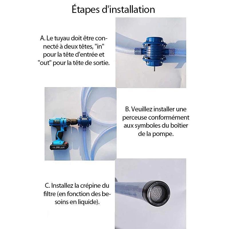 • C'est différent à la pompe à eau conventionnelle, ça peut être utilisé aucune alimentation externe requise, il suffit de connecter la perceuse à main électrique.